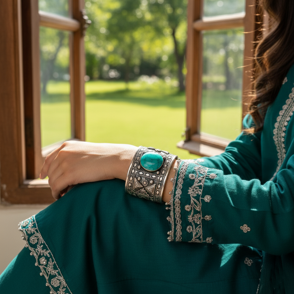 This exquisite Sangar cuff embodies the refined artistry of Afghan tribal silverwork, meticulously handcrafted using traditional techniques passed down through generations. Fashioned from premium silver, the cuff features ornate geometric motifs and ceremonial detailing characteristic of Pashtun craftsmanship. Its substantial presence and intricate surface work create an understated yet commanding aesthetic, ideal for discerning collectors and those who appreciate authentic cultural artifacts. A timeless investment piece that transcends fleeting trends, this cuff represents both artistic excellence and historical significance.